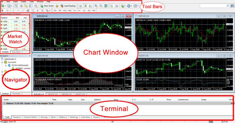 Au lancement, MT4 affiche quatre graphiques de paires de devises populaires : EURUSD, GBPUSD, USDCHF, USDJPY. L’interface peut sembler dense, mais chaque zone a son utilité.