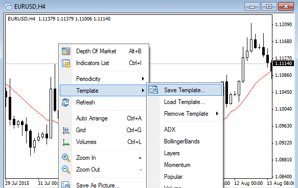 Pour ouvrir un nouveau graphique avec votre modèle personnalisé, ouvrez le graphique, faites un clic droit, choisissez « modèle », puis appliquez le modèle enregistré. Votre configuration s’applique alors à la nouvelle paire.