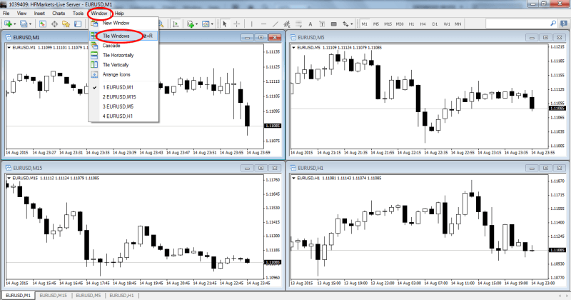Affichez quatre horizons de temps pour une seule paire sur le même écran en ouvrant quatre graphiques identiques, puis en appliquant à chacun une période différente (1 min, 5 min, 15 min, 1 h). Cliquez ensuite sur « fenêtre » dans la barre d’outils, puis sur « Tile Windows ». MT4 organise alors les fenêtres côte à côte de façon optimale.