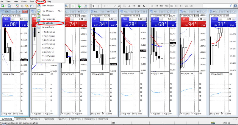 Pour surveiller plus de quatre graphiques, ouvrez-les tous, puis cliquez sur « Fenêtre » et sélectionnez « Tile Verticalement ». Toutes vos analyses prennent alors place côte à côte, comme sur l’image suivante :