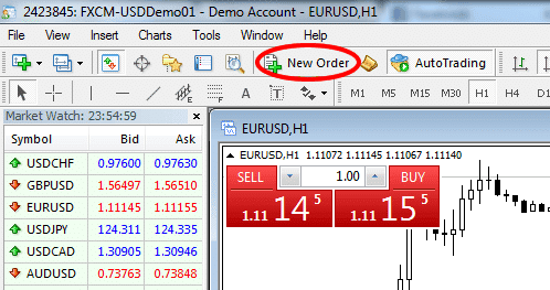 , Depuis le graphique actif : Un clic droit sur le graphique, sélectionnez « trading », puis « nouvel ordre ». Vous pouvez aussi utiliser le bouton Vente/Achat en haut à gauche, après avoir précisé le volume souhaité.