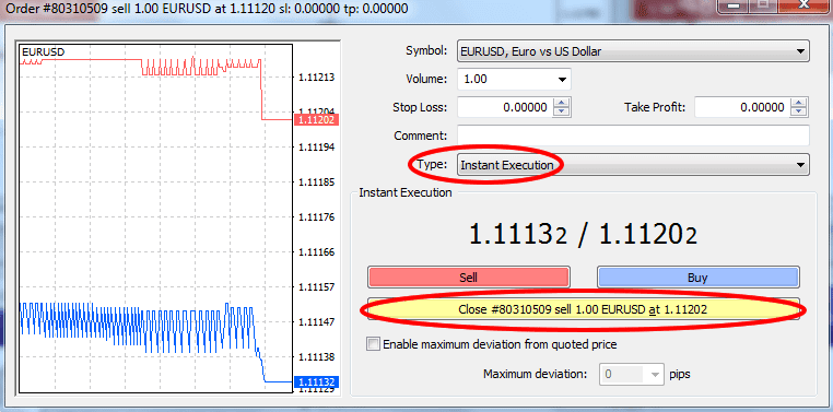 La marche à suivre est similaire : depuis le terminal, double-cliquez sur l’ordre à fermer. Dans la fenêtre qui apparaît, sélectionnez « exécution du marché » dans « type », puis cliquez sur « fermer ».