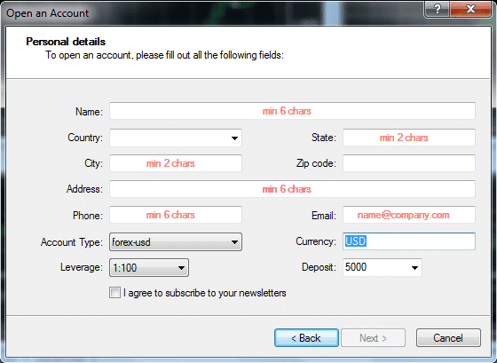 Un formulaire s’affiche : renseignez les champs demandés, choisissez la devise, le type de compte, l’effet de levier et le montant. Cochez la case d’abonnement à la newsletter, puis cliquez à nouveau sur suivant.