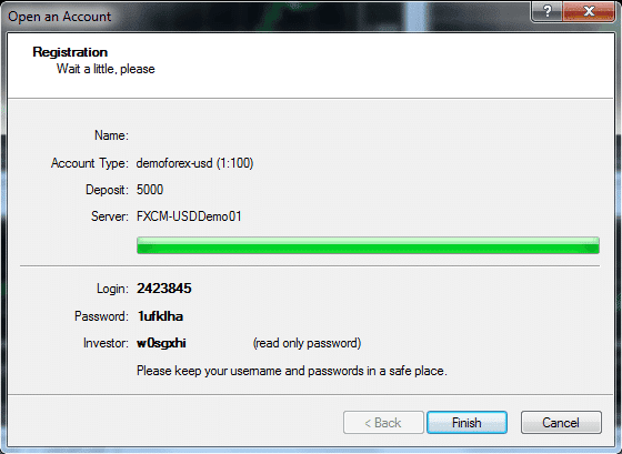MT4 vous attribue alors un identifiant et un mot de passe : conservez-les à portée de main. Un clic sur Terminer, et vous voilà connecté à votre nouveau compte de démonstration.