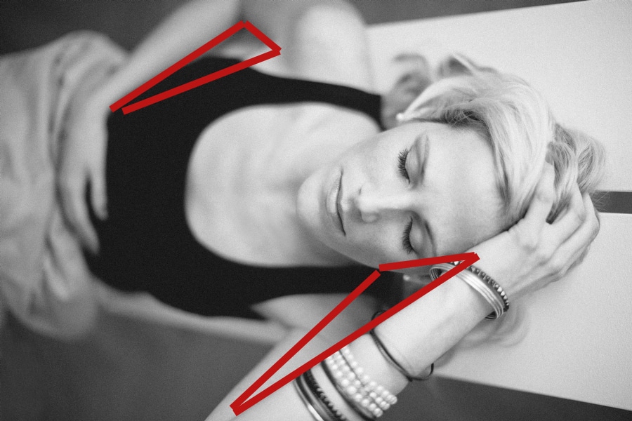 Ici, la logique reste la même : valoriser la forme, sculpter la pose. Demandez par exemple d’avancer légèrement un genou, de placer une main différemment. En créant des triangles, des asymétries, vous apportez du dynamisme à la photo.