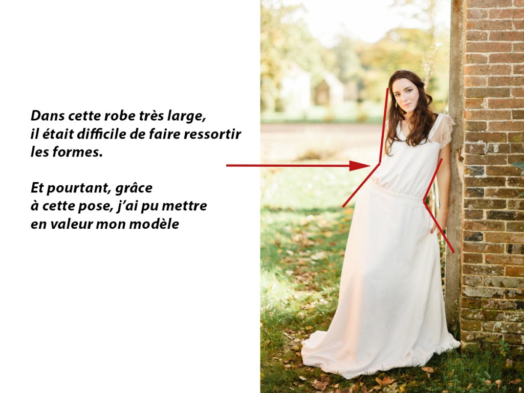- En créant un angle avec les épaules ou en dessinant une diagonale avec la robe, la silhouette s’affine et prend de la légèreté.